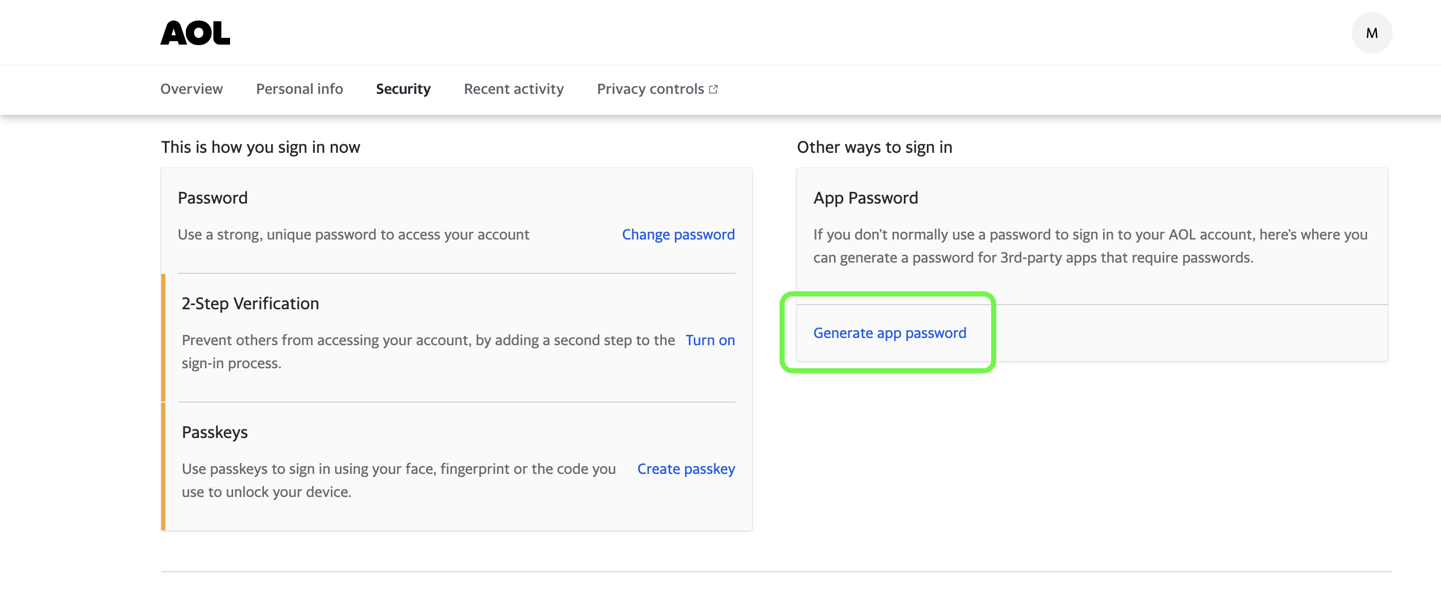 Next, go to the Security tab and click "Generate app Password" from Other ways to sign in tab: