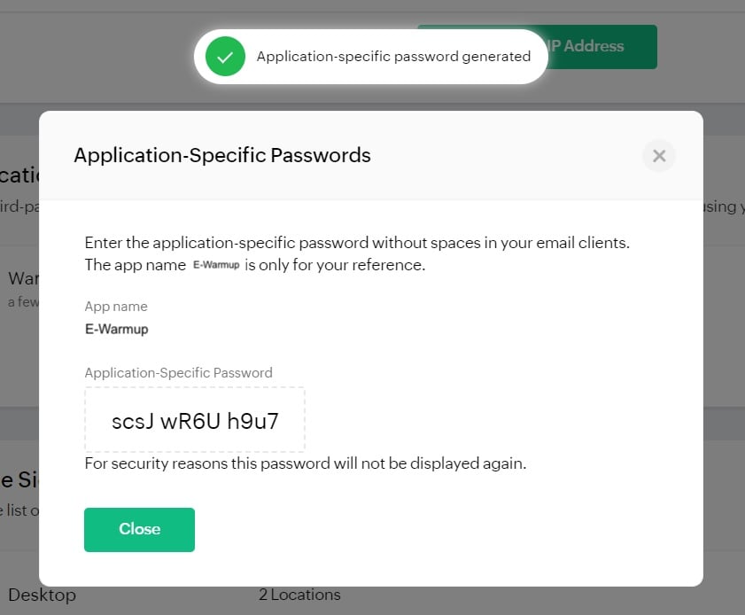 Use this app password to connect your Zoho/Zoho Pro mailbox to E-Warmup.