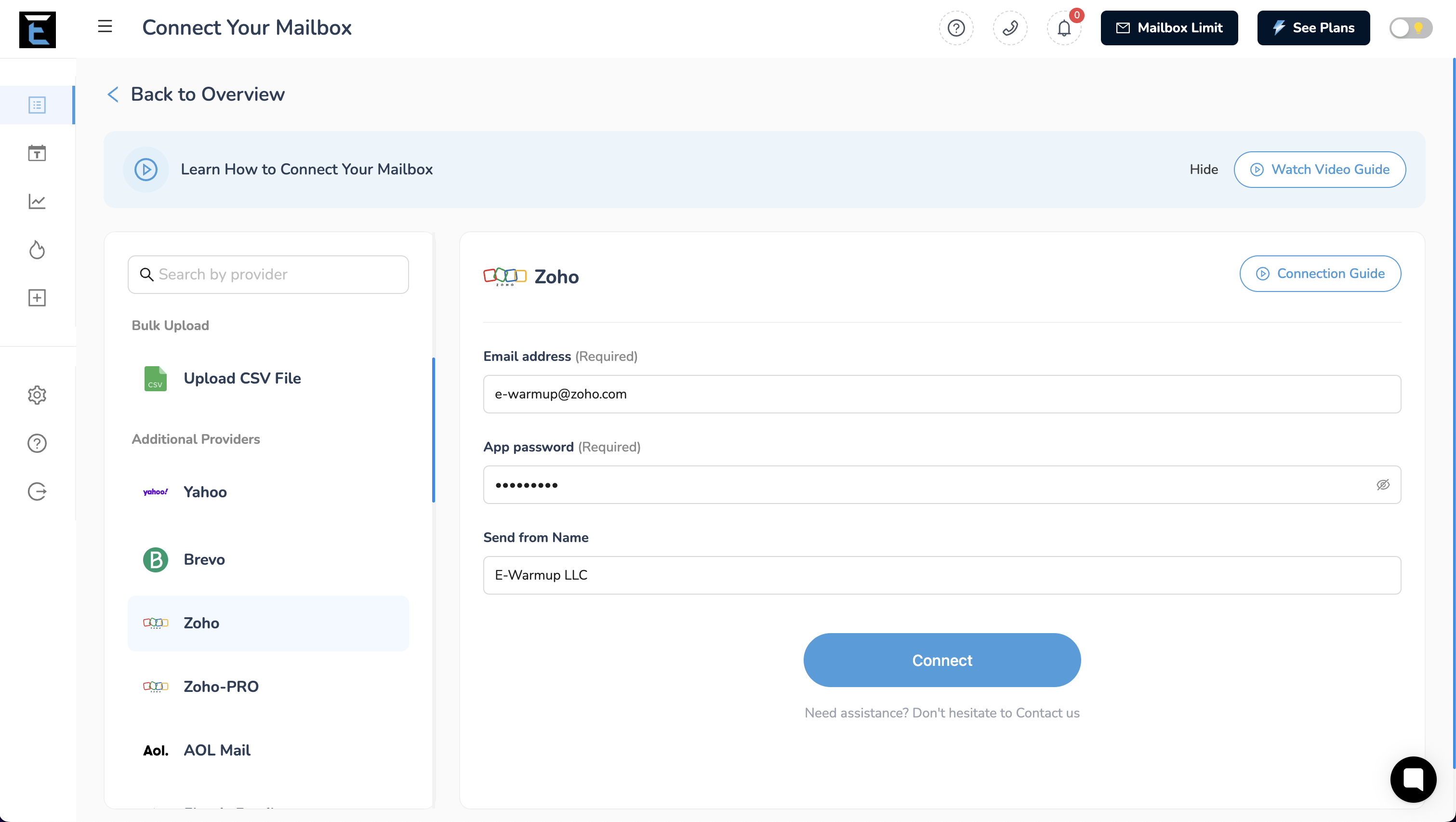 To connect Zoho/Zoho Pro mailbox to our warmup tool, you can follow these steps: