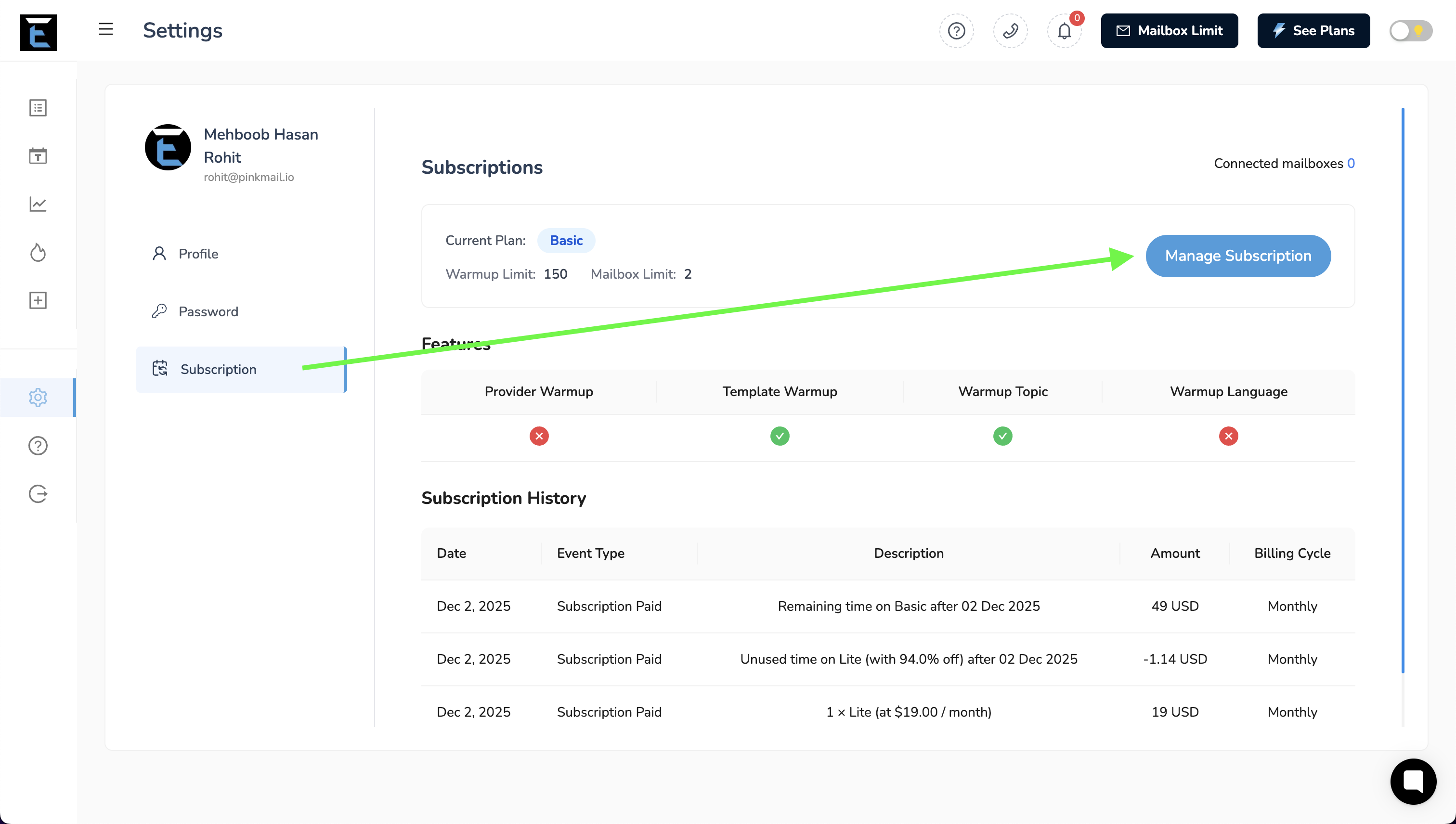 Continued Access: Your email warmup features and full paid plan benefits remain active until the end of your current paid billing period.